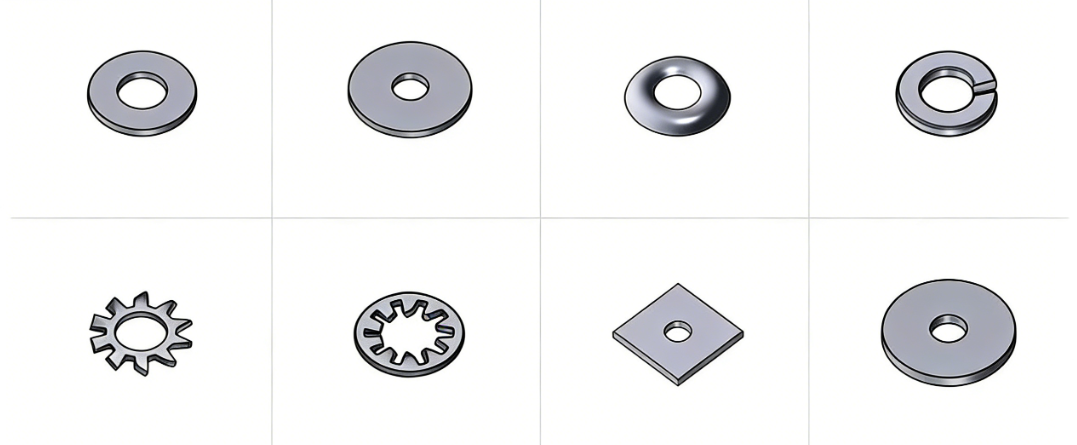 ④ Certaines rondelles sont dotées de conceptions spécialisées pour empêcher le desserrage des écrous. Communément appelées rondelles de blocage, celles-ci se présentent sous diverses configurations : à fentes, en forme d'étoile, en forme de vague, etc. De telles rondelles de blocage doivent être utilisées conjointement avec des écrous.